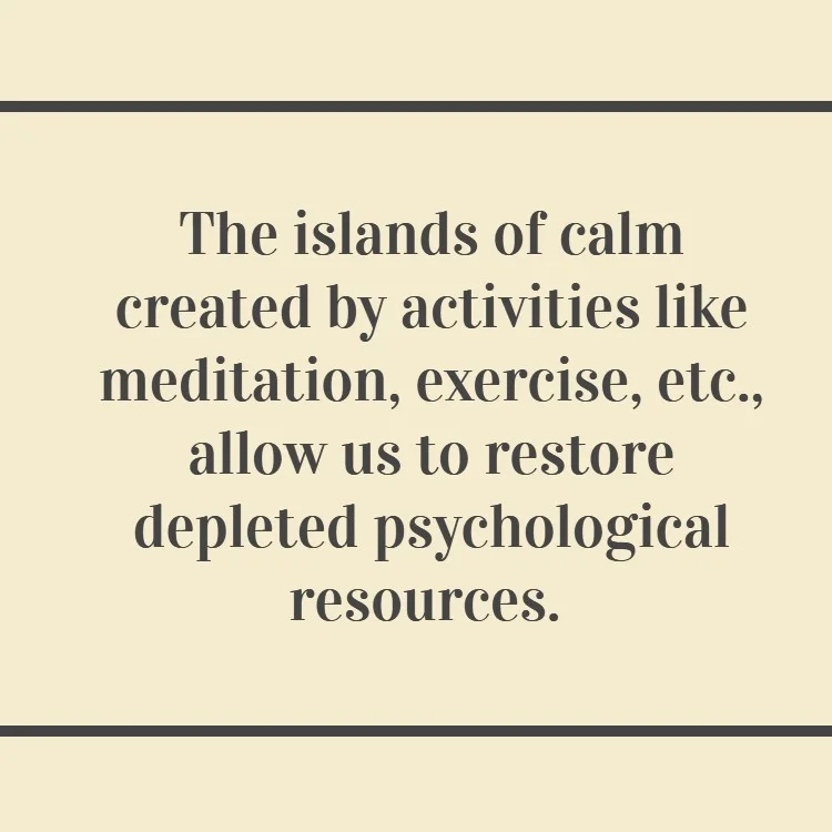 The islands of calm created by activities like meditation, exercise, etc., allow us to restore depleted psychological resources. We recharge our energy, and return to face life’s challenges with a greater sense of equilibrium and confidence. Then, when emotionally charged interactions arise with others, it is becomes easier to respond in ways that are effective.