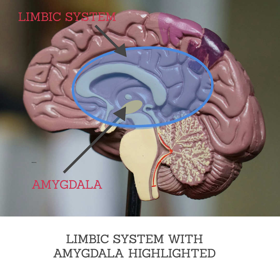 Let’s begin by looking at the limbic system, which is found toward the center of the brain and is sometimes called the ‘seat of emotions.’ Within the limbic system is the amygdala, an almond-shaped structure on each side of the brain.
